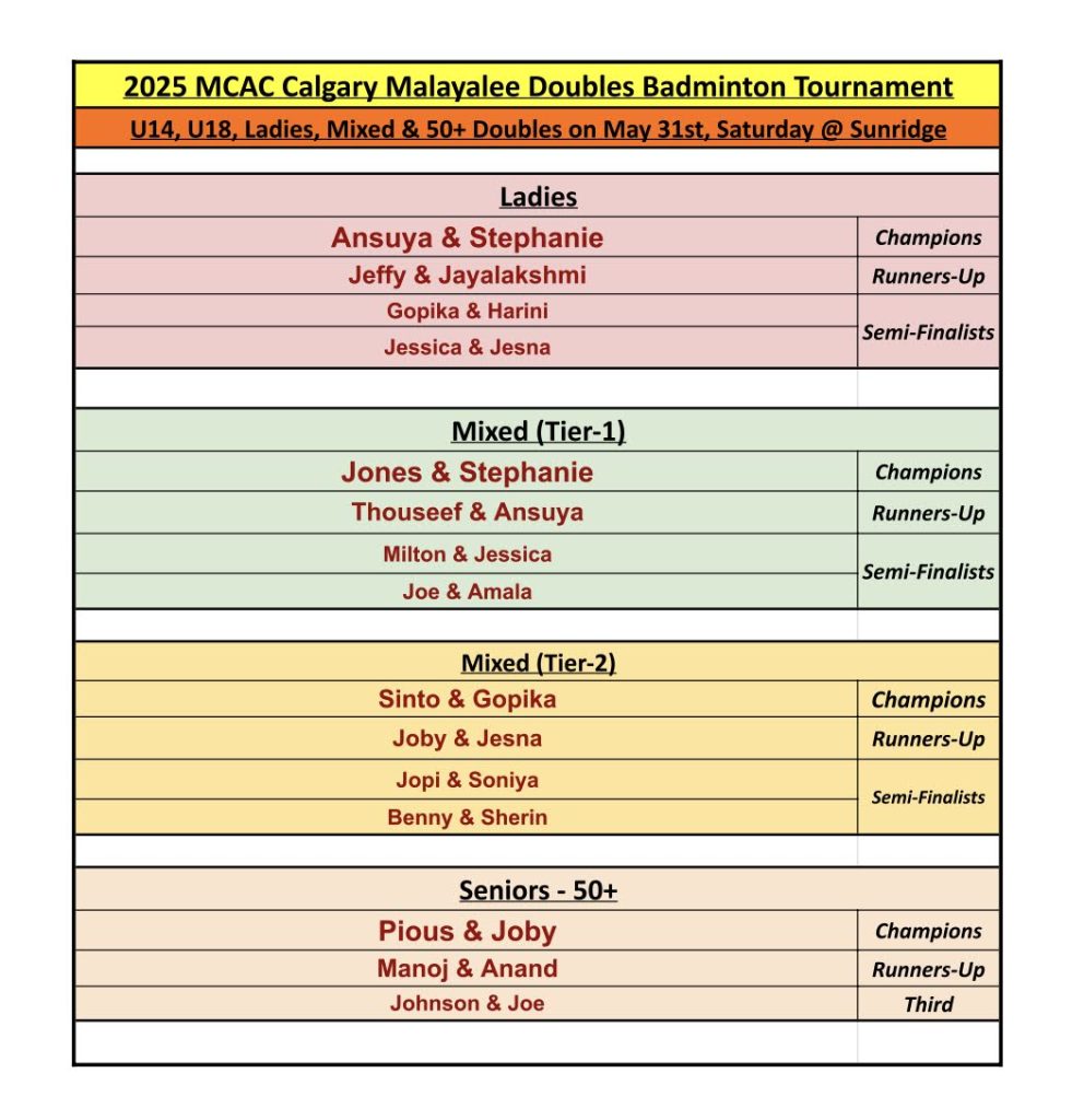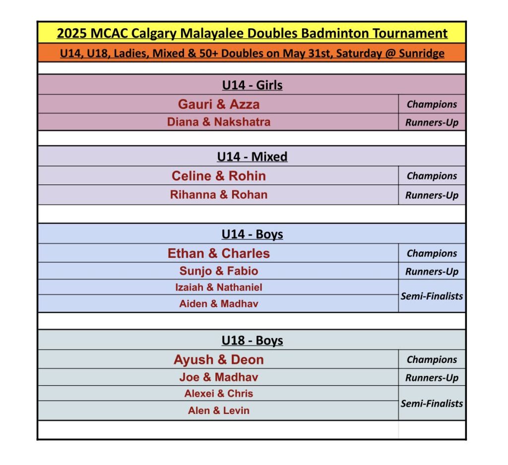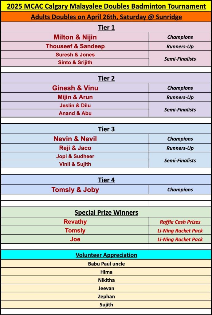 The first tournament of 2025 took place on April 26 at the Sunridge Badminton Centre, signaling the official launch of MCAC’s spring sports season. The event brought together a dynamic mix of adult players from the Calgary Malayalee community—seasoned athletes, weekly regulars, and first-time participants—all ready to compete with grit and poise.